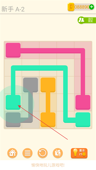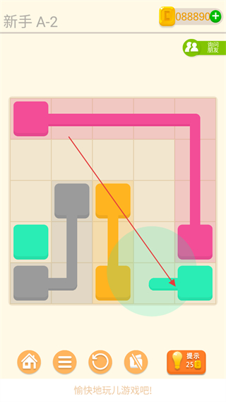 3、依次連接所有顏色的方塊對(duì),完成整個(gè)網(wǎng)格的連線后,即可通關(guān)。