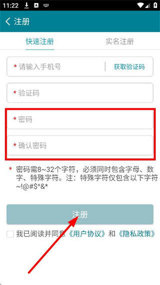 5、在設置密碼并確認后勾選同意,點擊注冊,完成賬號注冊操作。