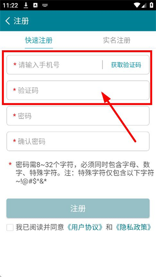 4、在快速注冊頁面,輸入手機號,點擊獲取驗證碼并輸入。