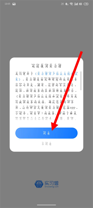1、打開實習僧,在用戶協(xié)議彈窗中,點擊同意。