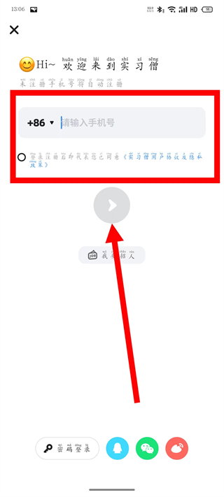 3、輸入手機號碼,勾選同意相關(guān)用戶協(xié)議后,點擊箭頭按鈕。