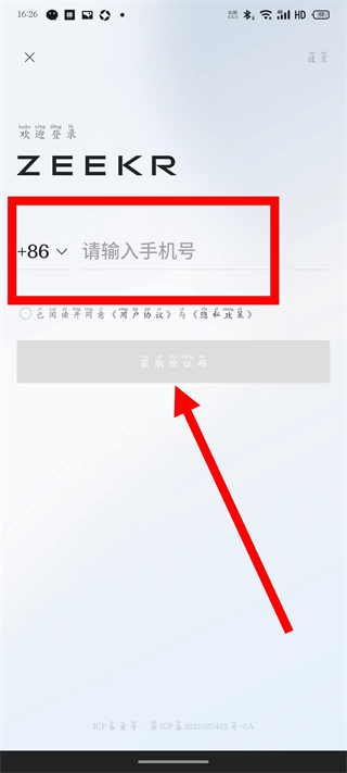 3、輸入手機號碼,勾選同意相關協(xié)議后,點擊獲取驗證碼。