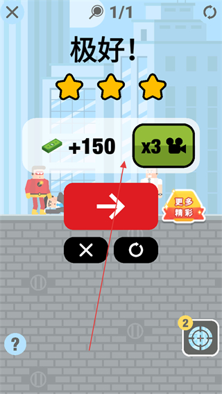 4、關(guān)卡完成后獲得+150金幣獎勵,可點擊紅色箭頭進入下一關(guān)或觀看視頻獲得3倍獎勵。