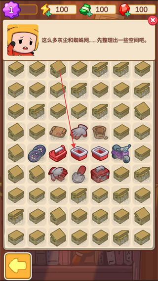 1、清理滿是灰塵和蜘蛛網(wǎng)的區(qū)域,點(diǎn)擊物品整理出空間。