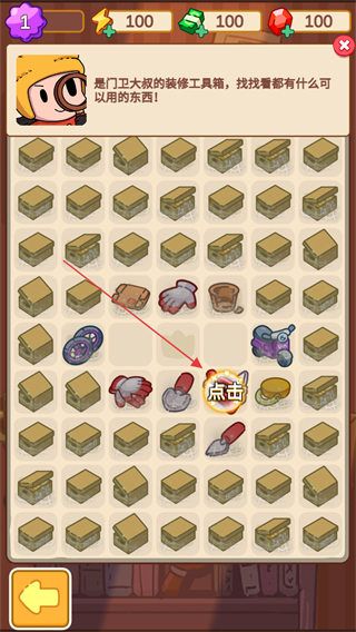 3、查看門衛(wèi)大叔的裝修工具箱,點(diǎn)擊其中物品尋找可用工具。